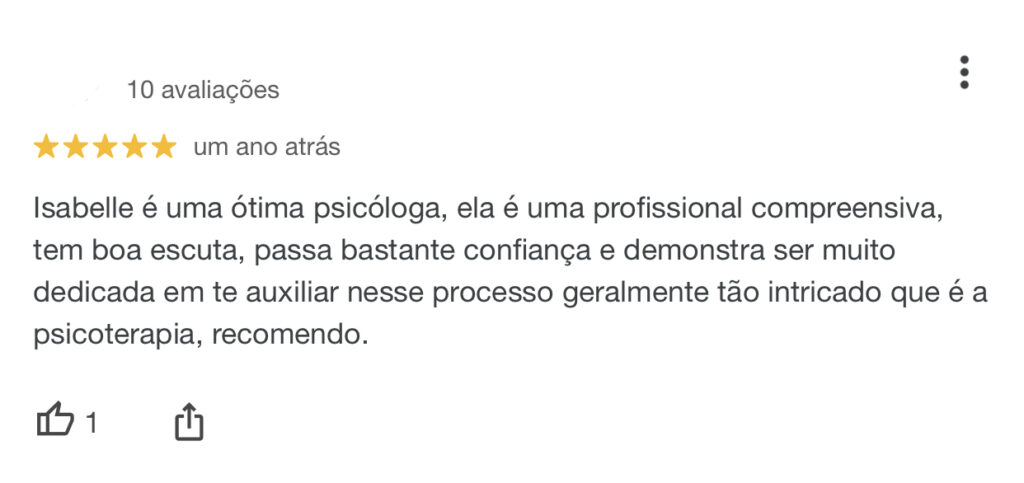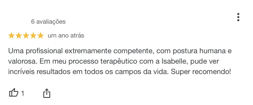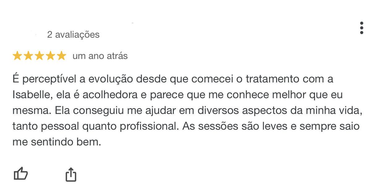 Amanda AlmeidaTrustindex verifica se a fonte original da avaliação é Google. Desde o início fui acolhida com muita empatia e sensibilidade pela Isabelle. Sua forma de conduzir as sessões sempre me trouxe segurança e confiança para me abrir e olhar para dentro de mim. Durante o processo terapêutico, ela me ajudou a reconhecer padrões negativos de pensamento que eu não percebia sozinha, e isso foi fundamental para transformar a forma como eu relaciono comigo mesma. Sou muito grata pelo cuidado, pela forma com que fui ouvida e pelo apoio constante. A Isa fez toda a diferença no meu processo de autoconhecimento e evolução pessoal.Publicado em Priscila CardosoTrustindex verifica se a fonte original da avaliação é Google. É perceptível a evolução desde que comecei o tratamento com a Isabelle, ela é acolhedora e parece que me conhece melhor que eu mesma. Ela conseguiu me ajudar em diversos aspectos da minha vida, tanto pessoal quanto profissional. As sessões são leves e sempre saio me sentindo bem.Publicado em Tatá InácioTrustindex verifica se a fonte original da avaliação é Google. Uma profissional extremamente competente, com postura humana e valorosa. Em meu processo terapêutico com a Isabelle, pude ver incríveis resultados em todos os campos da vida. Super recomendo!Publicado em Pietro KamishiroTrustindex verifica se a fonte original da avaliação é Google. Minhas experiências com Isabelle têm sido muito benéficas e esclarecedoras. Recomendo de olhos fechadosPublicado em Katharine SchrammTrustindex verifica se a fonte original da avaliação é Google. Isabelle é uma ótima psicóloga, ela é uma profissional compreensiva, tem boa escuta, passa bastante confiança e demonstra ser muito dedicada em te auxiliar nesse processo geralmente tão intricado que é a psicoterapia, recomendo.Publicado em Stéfani de Melo PessoaTrustindex verifica se a fonte original da avaliação é Google. Psicóloga muito competente, empática e afetuosa! Super indico!Publicado em Pedro IvoTrustindex verifica se a fonte original da avaliação é Google. Psicóloga super atenciosa e competente! Me ajuda demais sempre!Publicado em Carolina BarrosTrustindex verifica se a fonte original da avaliação é Google. Indico o trabalho da Isabelle com muita confiança! Excelente profissional.Publicado em Advogado Marx NairoTrustindex verifica se a fonte original da avaliação é Google. Excelente!! Muito simpática e acolhedora! Tornou tudo agradável e fez com que a experiência fosse inesquecível! Virou minha psicóloga particular e de 4 integrantes da minha família! Recomendo!!!Publicado em Avaliação totalizada Google 5.0 de 5,